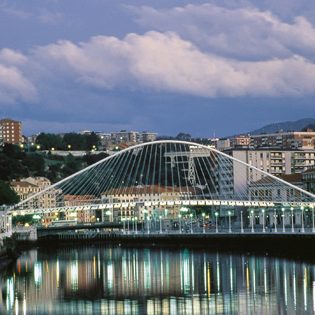 También conocido como “puente de Calatrava” por el arquitecto que lo construyó, es una estructura arqueada, blanca y esbelta, que semeja ser un barco de vela a diez metros de altura sobre la Ría. Su superficie acristalada ha generado mucha controversia, por eso hoy en día lo que se pisa es un felpudo antideslizante. Une Uribarte con el Campo Volantín y, pese a la polémica que siempre le ha acompañado, es uno de los símbolos de la ciudad.